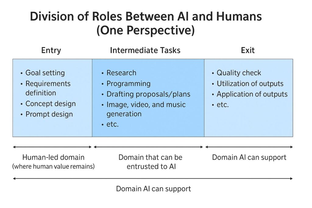 As one way of looking at the division of roles between AI and humans, I believe the diagram below provides a useful perspective. Already, every task humans perform can be supported by AI from beginning to end. Yet the areas where human value truly remains are likely at the entry and exit points of the process. The middle portions, in contrast, are often best left entirely to AI.